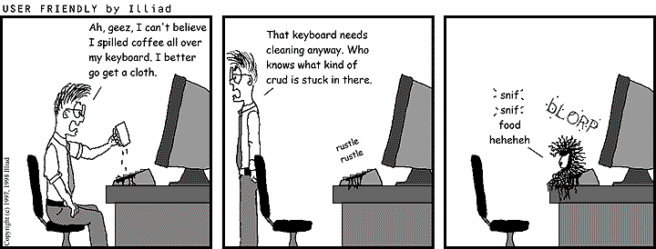TRANSCRIPTION: STEF: Ah, geez, I can't believe I spilled coffee all over my keyboard. I better go get a cloth. STEF: That keyboard needs cleaning anyway. Who knows what kind of crud is stuck in there. rustle rustle CRUD PUPPY: *snif* *snif* food heheheh bLORP |