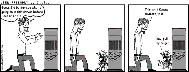 TRANSCRIPTION: PITR: Guess I'd better see what's going on in this server before Stef has a fit. PITR: This isn't Kansas anymore, is it? CRUD PUPPY: Hey, pull my finger. |