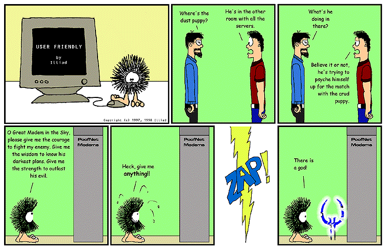 TRANSCRIPTION: PITR: Where's the dust puppy? A.J.: He's in the other room with all the servers. PITR: What's he doing in there? A.J.: Believe it or not, he's trying to psyche himself up for the match with the crud puppy. DUST PUPPY: O Great Modem in the Sky, please give me the courage to fight my enemy. Give me the wisdom to know his darkest plans. Give me the strength to outlast his evil. DUST PUPPY: HECK, GIVE ME ANYTHING!! ZAP! DUST PUPPY: There is a god! |