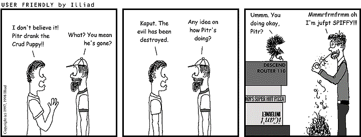 TRANSCRIPTION: A.J.: I don't believe it! Pitr drank the Crud Puppy!! MIKE: What? You mean he's gone? A.J.: Kaput. The evil has been destroyed. MIKE: Any idea on how Pitr's doing? DUST PUPPY: Ummm. You doing okay, Pitr? PITR: Mmmrfrmfrmm oh I'm jufpt SPIFFY!!! |