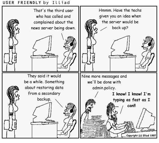 TRANSCRIPTION: MIRANDA: That's the third user who has called and complained about the news server being down. HILLARY: Hmmm. Have the techs given you an idea when the server would be back up? MIRANDA: They said it would be a while. Something about restoring data from a secondary backup. PITR: Nine more messages and we'll be done with admin.policy. MIKE: I know! I know! I'm typing as fast as I can!! |