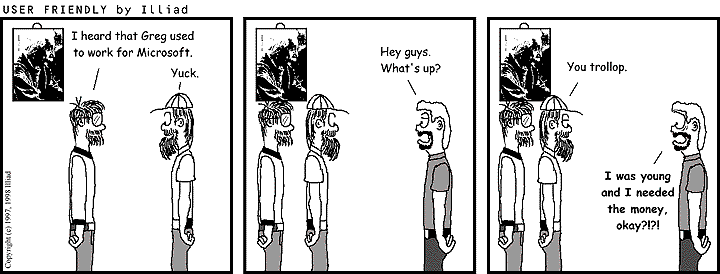 TRANSCRIPTION: PITR: I heard that Greg used to work for Microsoft. MIKE: Yuck. GREG: Hey guys. What's up? MIKE: You trollop. GREG: I was young and I needed the money, okay?!?! |