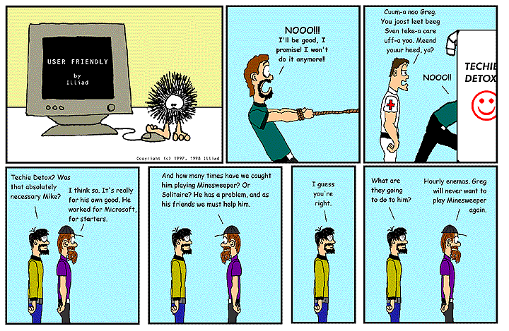 TRANSCRIPTION: GREG: NOOO!!! I'll be good, I promise! I won't do it anymore!! SVEN: Cuum-o noo Greg. You joost leet beeg Sven teke-a care uff-a yoo. Meend youur heed, ya? GREG: NOOO!!! PITR: Techie Detox. Was that absolutely necessary Mike? MIKE: I think so. It's really for his own good. He worked for Microsoft, for starters. MIKE: And how many times have we caught him playing Minesweeper? Or Solitaire? He has a problem, and as his friends we must help him. PITR: I guess you're right PITR: What are they going to do to him? MIKE: Hourly enemas. Greg will never want to play Minesweeper again. |