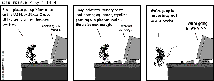 TRANSCRIPTION: DUST PUPPY: Erwin, please pull up information on the US Navy SEALs. I need all the cool stuff on them you can find. ERWIN: Searching. OK, found it. DUST PUPPY: Okay, balaclava, military boots, load-bearing equipment, rapelling gear, rope, explosives, radio... Should be easy enough. ERWIN: What are you doing? DUST PUPPY: We're going to rescue Greg. Get us a helicopter. ERWIN: We're going to WHAT?!?! |