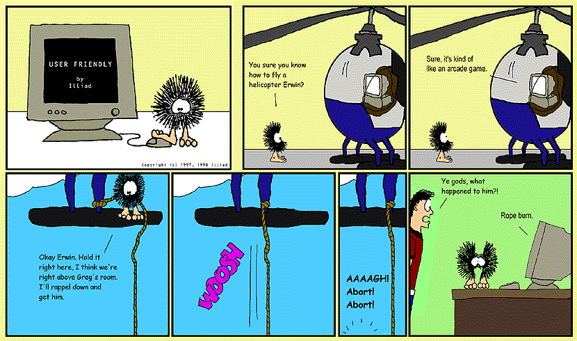 TRANSCRIPTION: DUST PUPPY: You sure you know how to fly a helicopter Erwin? ERWIN: Sure, it's kind of like an arcade game. DUST PUPPY: Okay Erwin. Hold it right here, I think we're right above Greg's room. I'll rappel down and get him. WOOSH DUST PUPPY: AAAAGH! Abort! Abort! A.J.: Ye gods, what happened to him?! ERWIN: Rope burn. |