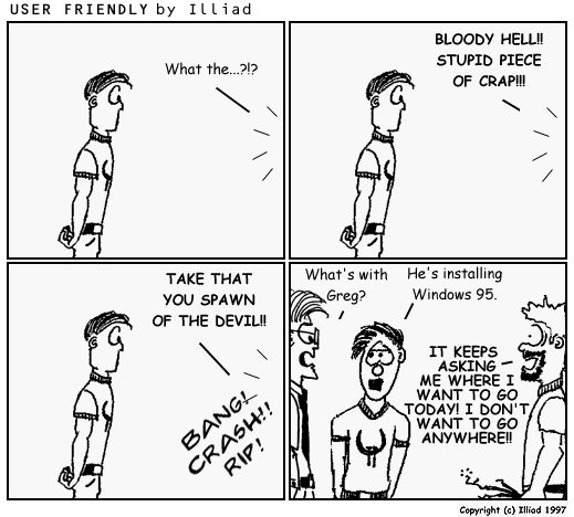 TRANSCRIPTION: GREG: What the...?!? GREG: BLOODY HELL!! STUPID PIECE OF CRAP!!! GREG: TAKE THAT YOU SPAWN OF THE DEVIL!! BANG! CRASH!! RIP! STEF: What's with Greg? A.J.: He's installing Windows 95. GREG: IT KEEPS ASKING ME WHERE I WANT TO GO TODAY! I DON'T WANT TO GO ANYWHERE!! |