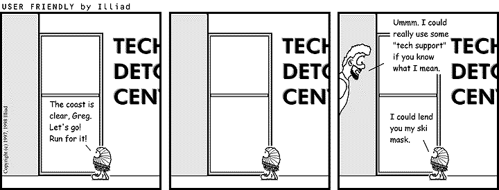 TRANSCRIPTION: DUST PUPPY: The coast is clear, Greg. Let's go! Run for it! GREG: Ummm, I could really use some "tech support" if you know what I mean. DUST PUPPY: I could lend you my ski mask. |