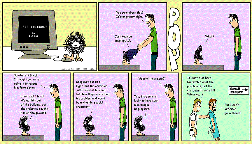 TRANSCRIPTION: A.J.: You sure about this? It's on pretty tight. DUST PUPPY: Just keep on tugging A.J. POP DUST PUPPY: What? A.J.: So where's Greg? I thought you were going in to rescue him from detox. DUST PUPPY: Erwin and I tried. We got him out of the building, but the orderlies caught him on the grounds. DUST PUPPY: Greg sure put up a fight. But the orderlies just smiled at him and told him they understood his problem and would be giving him special treatment. A.J.: "Special treatment?" DUST PUPPY: Yes, Greg sure is lucky to have such nice people helping him. NURSE: It's not that hard. No matter what the problem is, tell the customer to reinstall Windows. GREG: But I don't WANNA go in there!! |