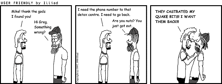TRANSCRIPTION: GREG: Mike! thank the gods I found you! MIKE: Hi Greg. Something wrong? GREG: I need the phone number to that detox centre. I need to go back. MIKE: Are you nuts? You just got out. GREG: THEY CASTRATED MY QUAKE BITS! I WANT THEM BACK!!! |