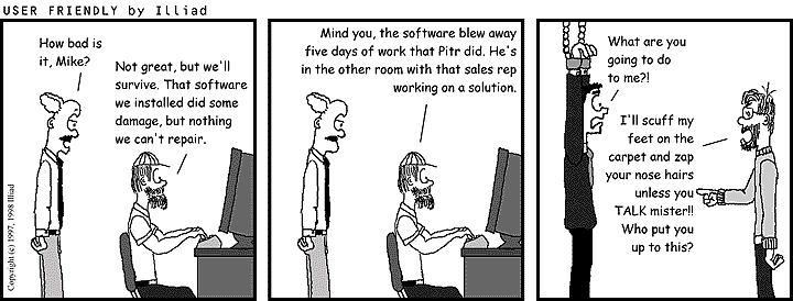 TRANSCRIPTION: CHIEF: How bad is it, Mike? MIKE: Not great, but we'll survive. That software we installed did some damage, but nothing we can't repair. MIKE: Mind you, the software blew away five days of work that Pitr did. He's in the other room with that sales rep working on a solution. SALESMAN: What are you going to do to me?! PITR: I'll scuff my feet on the carpet and zap your nose hairs unless you TALK mister!! Who put you up to this? |