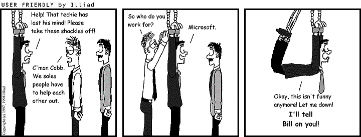 TRANSCRIPTION: SALESMAN: Help! That techie has lost his mind! Please take these shackles off! STEF: C'mon Cobb. We sales people have to help each other out. STEF: So who do you work for? SALESMAN: Microsoft. SALESMAN: Okay, this isn't funny anymore! Let me down! I'll tell Bill on you!! |