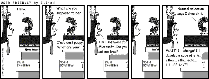 TRANSCRIPTION: DUST PUPPY: Hello. SALESMAN: What are you supposed to be? DUST PUPPY: I'm a dust puppy. What are you? SALESMAN: I sell software for Microsoft. Can you set me free? DUST PUPPY: Natural selection says I shouldn't. SALESMAN: WAIT! I'll change! I'll develop a code of eth... ether... ethi.. ecto... I'LL BEHAVE!! |