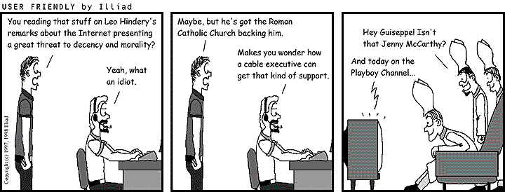 TRANSCRIPTION: A.J.: You reading that stuff on Leo Hindery's remarks about the Internet presenting a great threat to decency and morality? GREG: Yeah, what an idiot. A.J.: Maybe, but he's got the Roman Catholic Church backing him. GREG: Makes you wonder how a cable executive can get that kind of support. BISHOP: Hey Guiseppe! Isn't that Jenny McCarthy? TV: And today on the Playboy Channel... |