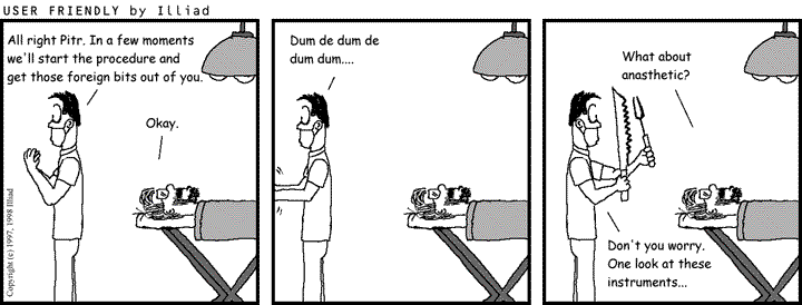 TRANSCRIPTION: SURGEON: All right Pitr. In a few moments we'll start the procedure and get those foreign bits out to you. PITR: Okay. SURGEON: Dum de dum de dum dum.... PITR: What about anasthetic? SURGEON: Don't you worry. One look at these instruments... |