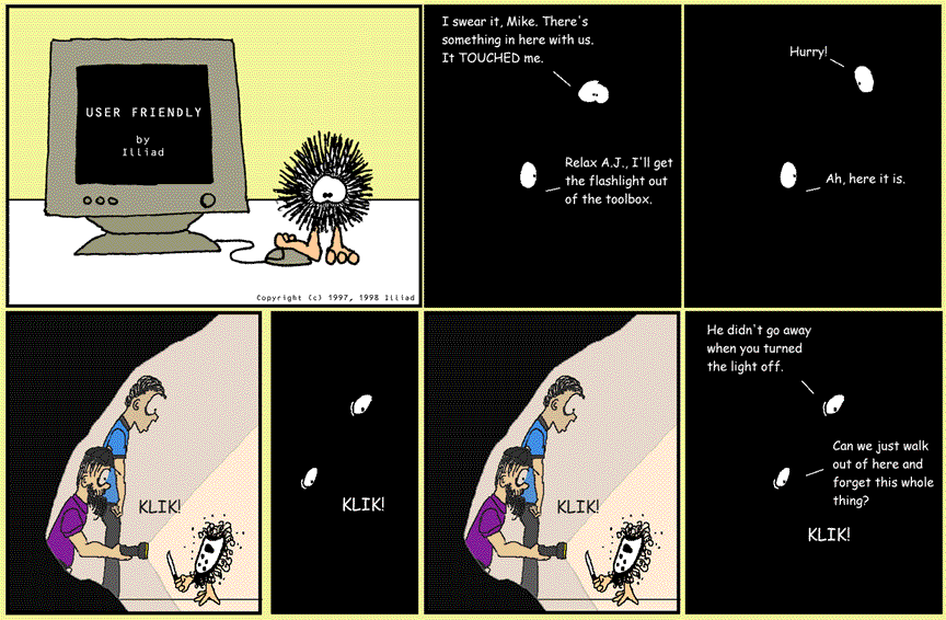 TRANSCRIPTION: A.J.: I swear it, Mike. There's something in here with us. It TOUCHED me. MIKE: Relax A.J., I'll get the flashlight out of the toolbox. A.J.: Hurry! MIKE: Ah, here it is. KLIK! KLIK! KLIK! A.J.: He didn't go away when you turned the light off. MIKE: Can we just walk out of here and forget this whole thing? KLIK! |