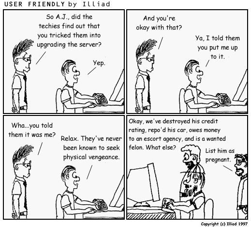 TRANSCRIPTION: STEF: So A.J., did the techies find out that you tricked them into upgrading the server? A.J.: Yep. STEF: And you're ok with that? A.J.: Ya, I told them you put me up to it. STEF: Wha...you told them it was me? A.J.: Relax. They've never been known to seek physical vengeance. GREG: Ok, we've destroyed his credit rating, repo'd his car, owes money to an escort agency, and is a wanted felon. What else? PITR: List him as pregnant. |