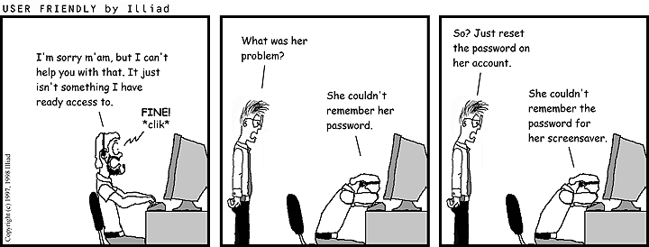 TRANSCRIPTION: GREG: I'm sorry m'am, but I can't help you with that. It just isn't something I have ready access to. CUSTOMER: FINE! *clik* STEF: What was her problem? GREG: She couldn't remember her password. STEF: So? Just reset the password on her account. GREG: She couldn't remember the password for her screensaver. |