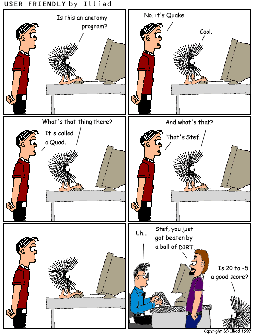TRANSCRIPTION: DUST PUPPY: Is this an anatomy program? A.J.: No, its Quake. DUST PUPPY: Cool. DUST PUPPY: What's that thing there? A.J. It's called a Quad. DUST PUPPY: And what's that? A.J.: That's Stef. STEF: Uh... GREG: Stef, you just got beaten by a ball of DIRT. DUST PUPPY: Is 20 to -5 a good score? |