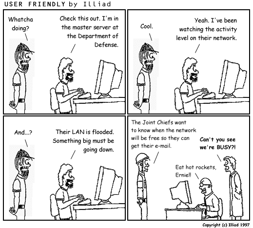 TRANSCRIPTION: MIKE: Whatcha doing? GREG: Check this out. I'm in the master server at the Department of Defense. MIKE: Cool. GREG: Yeah. I've been watching the activity level on their network. MIKE: And...? GREG: Their LAN is flooded. Something big must be going down. SOLDIER: The Joint Chiefs want to know when the network will be free so they can get their e-mail. SCIENTIST: Can't you see we're BUSY?! IT GUY: Eat hot rockets, Ernie!! |