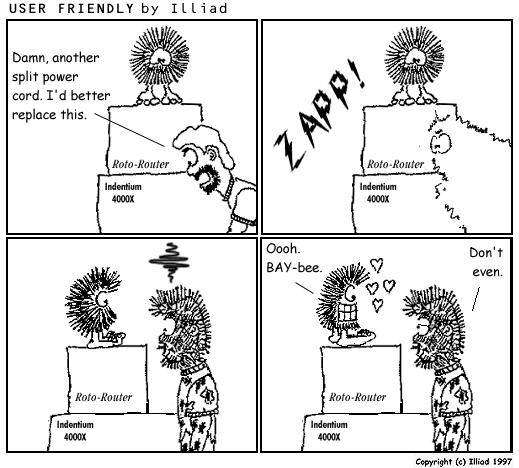 GREG: Damn, another split power cord. I'd better replace this. DUST PUPPY: Oooh. BAY-bee. GREG: Don't even.