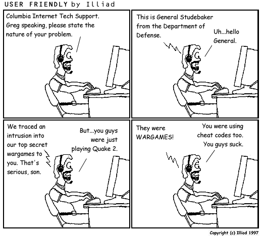 TRANSCRIPTION: GREG: Columbia Internet Tech Support. Greg speaking, please state the nature of your problem. GEN. STUDEBAKER: This is General Studebaker from the Department of Defense. GREG: Uh...hello General. GEN. STUDEBAKER: We traced an intrusion into our top secret wargames to you. That's serious, son. GREG: But...you guys were just playing Quake 2. GEN. STUDEBAKER: They were WARGAMES! GREG: You were using cheat codes too. You guys suck. |