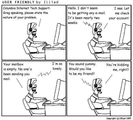 TRANSCRIPTION: GREG: Columbia Internet Tech Support. Greg speaking, please state the nature of your problem. CUSTOMER: Hello, I don't seem to be getting any e-mail. It's been nearly two weeks. GREG: I see. Let me check your account. GREG: Your mailbox is empty. No one's been sending you mail. CUSTOMER: I'm so lonely. CUSTOMER. You sound yummy. Would you like to be my friend? GREG: You're kidding me, right? |