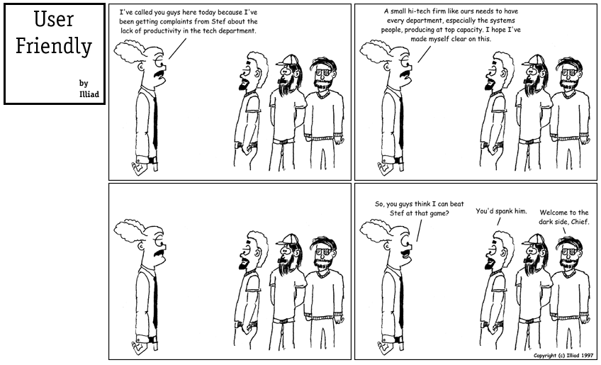 TRANSCRIPTION: CHIEF: I've called you guys here today because I've been getting complaints from Stef about the lack of productivity in the tech department. CHIEF: A small hi-tech firm like ours needs to have every department, especially the systems people, producing at top capacity. I hope I've made myself clear on this. CHIEF: So, you guys think I can beat Stef at that game? GREG: You'd spank him. PITR: Welcome to the dark side, Chief. |