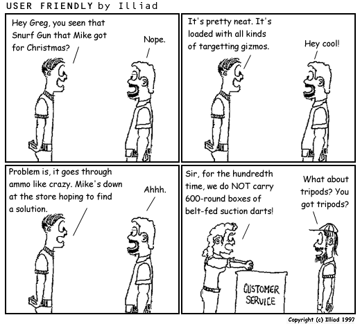 TRANSCRIPTION: A.J.: Hey Greg, you seen that Snurf Gun that Mike got for Christmas? GREG: Nope. A.J.: It's pretty neat. It's loaded with all kinds of targeting gizmos. GREG: Hey cool! A.J.: Problem is, it goes through ammo like crazy. Mike's down at the store hoping to find a solution. GREG: Ahhh. CUSTOMER SERVICE REP: Sir, for the hundredth time, we do NOT carry 600-round boxes of belt-fed suction darts! MIKE: What about tripods? You got tripods? |