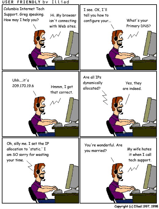TRANSCRIPTION: GREG: Columbia Internet Tech Support, Greg speaking. How may I help you? CUSTOMER: Hi. My browser isn't connecting to Web sites. GREG: I see. OK, I'll tell you how to configure your... CUSTOMER: What's your Primary DNS? GREG: Uhh...it's 209.170.19.6 CUSTOMER: Hmmm, I got that correctly. CUSTOMER: Are all IPs dynamically allocated? GREG: Yes, they are indeed. CUSTOMER: Oh, silly me. I set the IP allocation to 'static.' I am SO sorry for wasting your time. GREG: You're wonderful. Are you married? CUSTOMER: My wife hates it when I call tech support. |