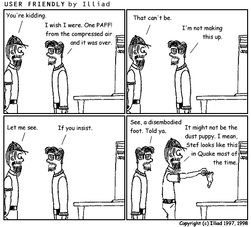 TRANSCRIPTION: MIKE: You're kidding. PITR: I wish I were. One PAFF! from the compressed air and it was over. MIKE: That can't be. PITR: I'm not making this up. MIKE: Let me see. PITR: If you insist. PITR: See, a disembodied foot. Told ya. MIKE: It might not be the dust puppy. I mean, Stef looks like this in Quake most of the time. |