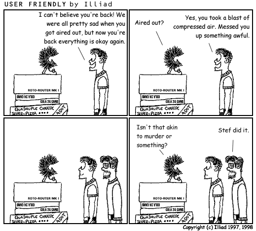 TRANSCRIPTION: A.J.: I can't believe you're back! We were all pretty sad when you got aired out, but now you're back everything is okay again. DUST PUPPY: Aired out? A.J.: Yes, you took a blast of compressed air. Messed you up something awful. DUST PUPPY: Isn't that akin to murder or something? PITR: Stef did it. |