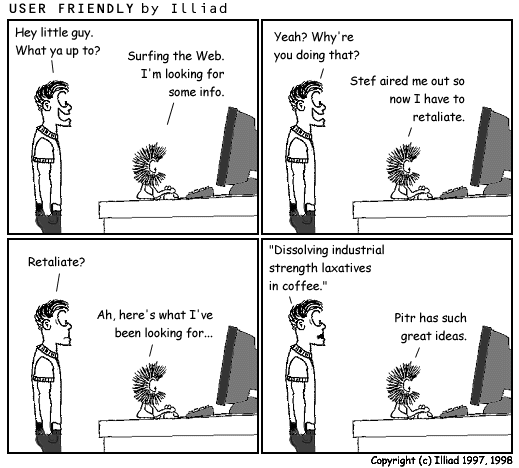 TRANSCRIPTION: A.J.: Hey little guy. What ya up to? DUST PUPPY: Surfing the Web. I'm looking for some info. A.J.: Yeah? Why're you doing that? DUST PUPPY: Stef aired me out so now I have to retaliate. A.J.: Retaliate? DUST PUPPY: Ah, here's what I've been looking for... A.J.: "Dissolving industrial strength laxatives in coffee." DUST PUPPY: Pitr has such great ideas. |