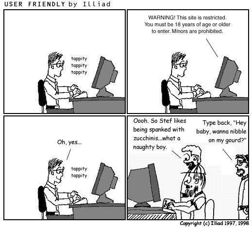 TRANSCRIPTION: tappity tappity tappity COMPUTER: WARNING! This site is restricted. You must be 18 years of age or older to enter. Minors are prohibited. STEF: Oh, yes... tappity tappity GREG: Oooh. So Stef likes being spanked with zucchinis...what a naughty boy. PITR: Type back, "Hey baby, wanna nibble on my gourd?" |