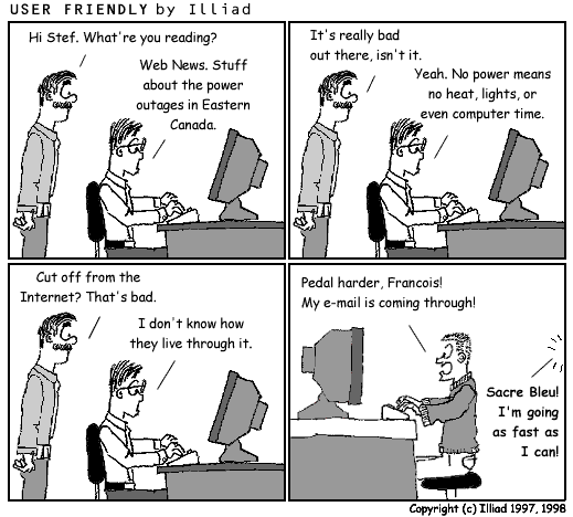 TRANSCRIPTION: COBB: Hi Stef. What're you reading? STEF: Web News. Stuff about the power outages in Eastern Canada. COBB: It's really bad out there, isn't it. STEF: Yeah. No power means no heat, lights, or even computer time. COBB: Cut off from the Internet? That's bad. STEF: I don't know how they live through it. CANADIAN: Pedal harder, Francois! My e-mail is coming through! FRANCOIS: Sacre Bleu! I'm going as fast as I can. |