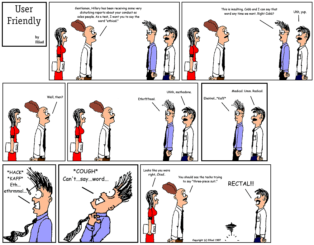 TRANSCRIPTION: CHIEF: Gentlemen, Hillary has been receiving some very disturbing reports about your conduct as sales people. As a test, I want you to say the word "ethical." STEF: This is insulting. Cobb and I can say that word anytime we want. Right Cobb? COBB: Uhh, yup. CHIEF: Well, then? STEF: Ethrfffmml. COBB: Uhhh, methodone. STEF: Ekekkol...*Kaff* COBB: Medical. Umm. Radical. STEF: *HACK* *KAFF* Eth... ethrmmal... STEF: *COUGH* Can't...say...word... HILLARY: Looks like you were right, Chief: CHIEF: You should see the techs trying to say "three-piece suit." COBB: RECTAL!!! |