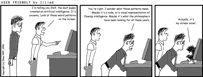 TRANSCRIPTION: A.J.: I'm telling you Stef, the dust puppy created an artificial intelligence. It's uncanny. Look at those weird patterns on the screen. STEF: You're right. I wonder what those patterns mean. Maybe it's a code, or a visual representation of flowing intelligence. Maybe it's what the philosophers have been looking for all these years. DUST PUPPY: Actually, it's my screen saver. |