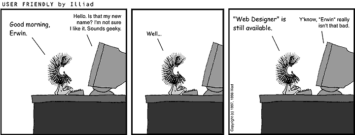 TRANSCRIPTION: DUST PUPPY: Good morning, Erwin. ERWIN: Hello. Is that my new name? I'm not sure I like it. Sounds geeky. DUST PUPPY: Well... DUST PUPPY: "Web Designer" is still available. ERWIN: Y'know, "Erwin" really isn't that bad. |