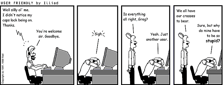 TRANSCRIPTION: CUSTOMER: Well silly ol' me. I didn't notice my caps lock being on. Thanks. GREG: You're welcome sir. Goodbye. GREG: Sigh. CHIEF: Is everything all right, Greg? GREG: Yeah. Just another user. CHIEF: We all have our crosses to bear. GREG: Sure, but why do mine have to be so stupid? |