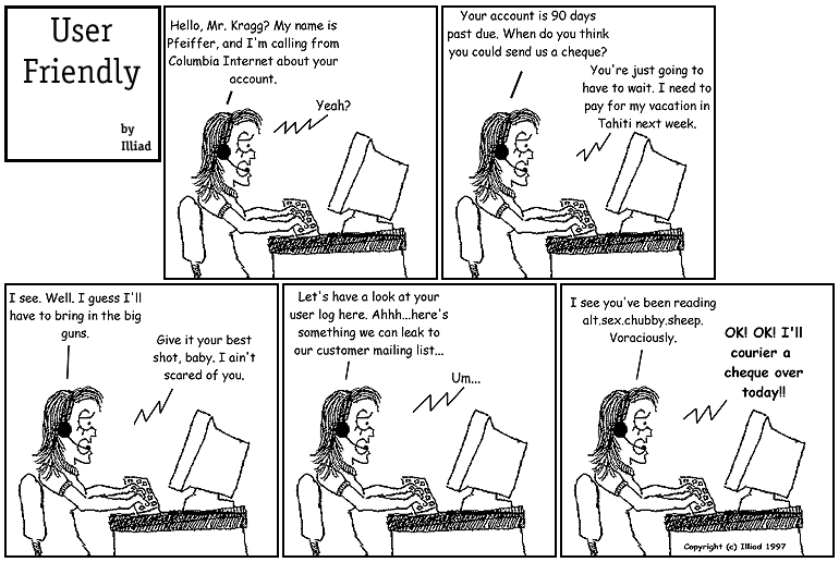 TRANSCRIPTION: PFEIFFER: Hello, Mr. Kragg? My name is Pfeiffer, and I'm calling from Columbia Internet about your account. MR. KRAGG: Yeah? PFEIFFER: Your account is 90 days past due. When do you think you could send us a cheque? MR. KRAGG: You're just going to have to wait. I need to pay for my vacation in Tahiti next week. PFEIFFER: I see. Well, I guess I'll have to bring in the big guns. MR. KRAGG: Give it your best shot, baby. I ain't scared of you. PFEIFFER: Let's have a look at your user log here. Ahhh... here's something we can leak to our customer mailing list... MR. KRAGG: Um... PFEIFFER: I see you've been reading alt.sex.chubby.sheep. Voraciously. MR. KRAGG: OK! OK! I'll courier a cheque over today!! |