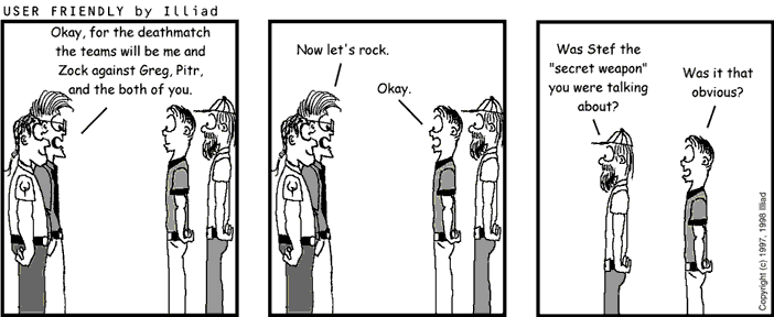 TRANSCRIPTION: STEF: Okay, for the deathmatch the teams will be me and Zock against Greg, Pitr, and the both of you. STEF: Now let's rock. A.J.: Okay. MIKE: Was Stef the "secret weapon" you were talking about? A.J.: Was it that obvious? |