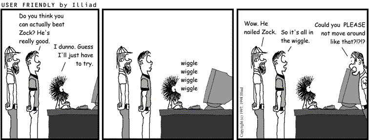 TRANSCRIPTION: A.J.: Do you think you can actually beat Zock? He's really good. DUST PUPPY: I dunno. Guess I'll just have to try. wiggle wiggle wiggle wiggle MIKE: Wow. He nailed Zock. A.J.: So it's all in the wiggle. ZOCK: Could you PLEASE not move around like that?!?!? |