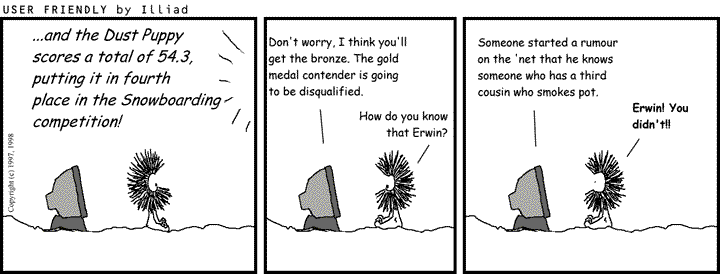 TRANSCRIPTION: JUDGE: ...and the Dust Puppy scores a total of 54.3, putting it in fourth place in the Snowboarding competition! ERWIN: Don't worry. I think you'll get the bronze. The gold medal contender is going to be disqualified. DUST PUPPY: How do you know that Erwin? ERWIN: Someone started a rumour on the 'net that he knows someone who has a third cousin who smokes pot. DUST PUPPY: Erwin! You didn't!! |