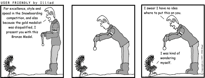 TRANSCRIPTION: JUDGE: For excellence, style and speed in the Snowboarding competition, and also because the gold medalist was disqualified, I present you with this Bronze Medal. JUDGE: I swear I have no idea where to put this on you. DUST PUPPY: I was kind of wondering myself. |