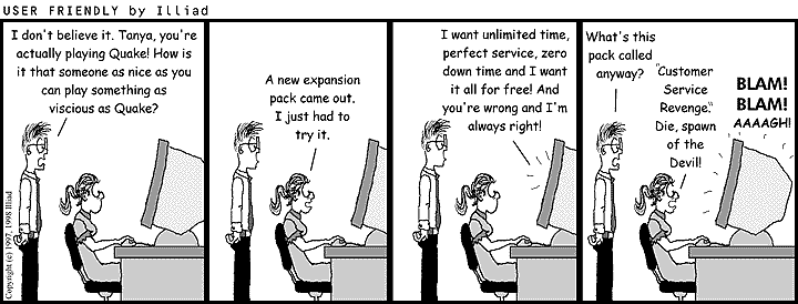 TRANSCRIPTION: STEF: I don't believe it. Tanya, you're actually playing Quake! How is it that someone as nice as you can play something as viscious as Quake. TANYA: A new expansion pack came out. I just had to try it. COMPUTER: I want unlimited time, perfect service, zero down time and I want it all for free! And you're wrong and I'm always right! STEF: What's this pack called anyway? TANYA: "Customer Service Revenge." Die, spawn of the Devil! BLAM! BLAM! AAAAGH! |