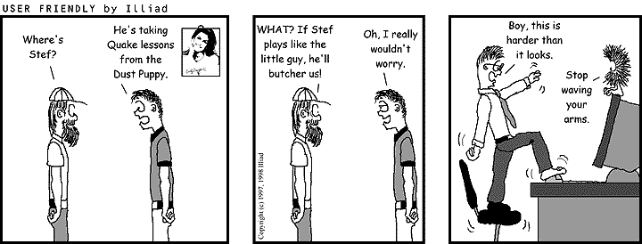 TRANSCRIPTION: MIKE: Where's Stef? A.J.: He's taking Quake lessons from the Dust Puppy. MIKE: WHAT? If Stef plays like the little guy, he'll butcher us! A.J.: Oh, I really wouldn't worry. STEF: Boy, this is harder than it looks. DUST PUPPY: Stop waving your arms. |